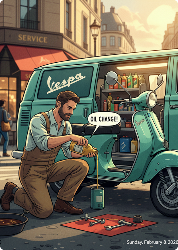 A Vespa performs at its best when maintained in alignment with the service intervals established by Piaggio, the manufacturer of Vespa. Annual oil and filter service remains essential, even when mileage is minimal.